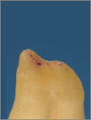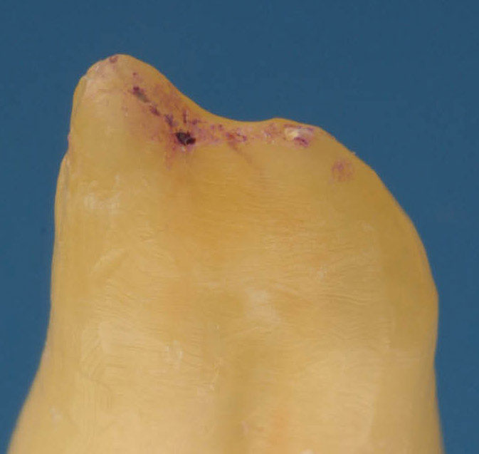 Die Pulpahohlräume waren vor der Behandlung violett angefärbt worden.